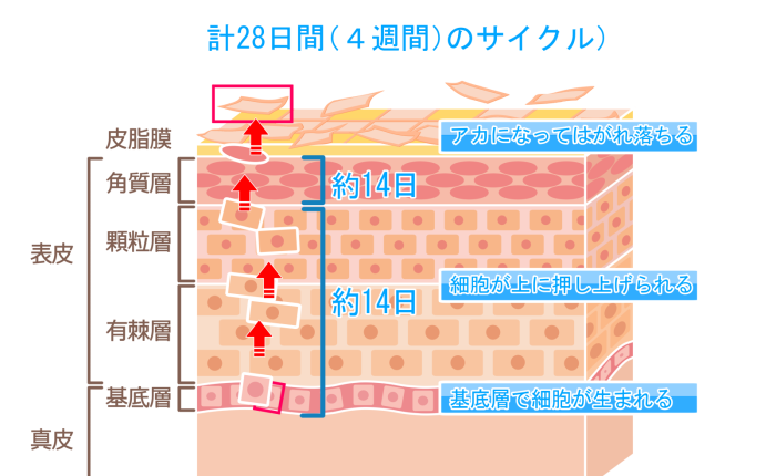 新しい皮膚が生まれ古い皮膚がはがれるサイクルをターンオーバーと言います。皮膚は何層にもに分類され、ターンオーバーに関係するのは表皮の部分です。表皮も何層にもなって分かれ、下部の層が古い細胞を押し上げて最終的に角質層からはがれ落ちます。お肌は生まれ変わりを繰り返し、健やかな状態を維持しています。
