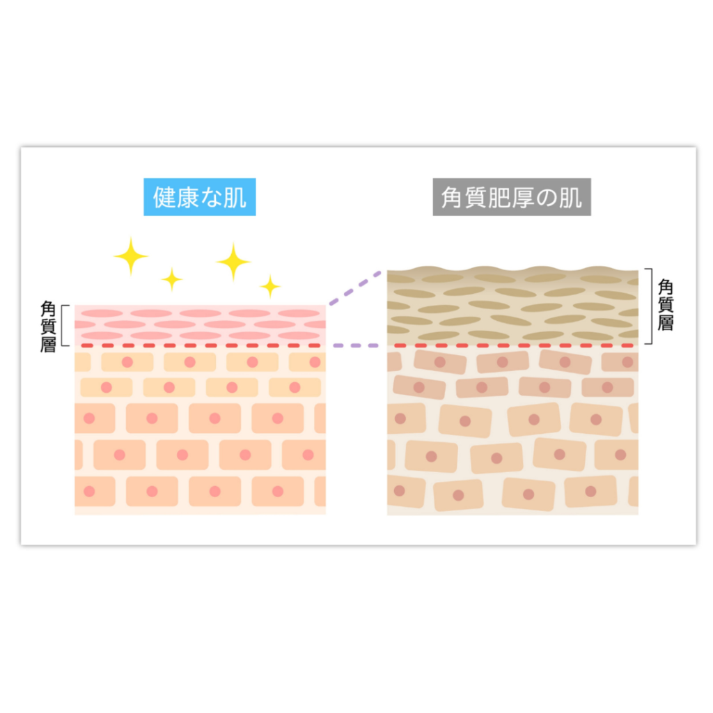 - 肌の透明感が失われ、厚い角質層が光を反射しづらく、老けた印象を与える